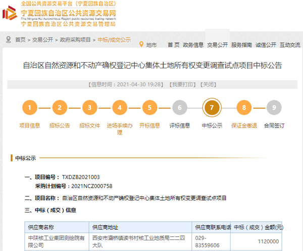 [2021-05-07]中陕核测绘院中标宁夏回族自治区自然资源和不动产确权登记集体土...近日,从宁夏回族自治区公共资源交易网获悉,中陕核测绘院中标自治区自然资源和不动产确权登记中心集体土地所有权变更调查试点项目(一标段)。该项目主要工作是对中宁县石...