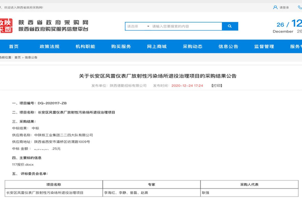 [2020-12-28]公司成功中标长安区风雷仪表厂放射性污染场所退役治理项目12月24日,公司成功中标长安区风雷仪表厂放射性污染场所退役治理项目。自今年5月集团环保产业整合以来,陕西核地环保工程有限公司依托军工铀矿勘探设施退役整治技术优势,...