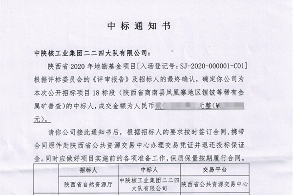 [2020-12-29]公司成功中标陕西省2020年地勘基金项目18标段12月25日,从陕西省自然资源厅获悉,公司成功中标陕西省2020年地勘基金项目18标段——陕西省商南县凤凰寨地区锂铍等稀有金属矿普查项目。为做好此次招投标工作,公司地质调...