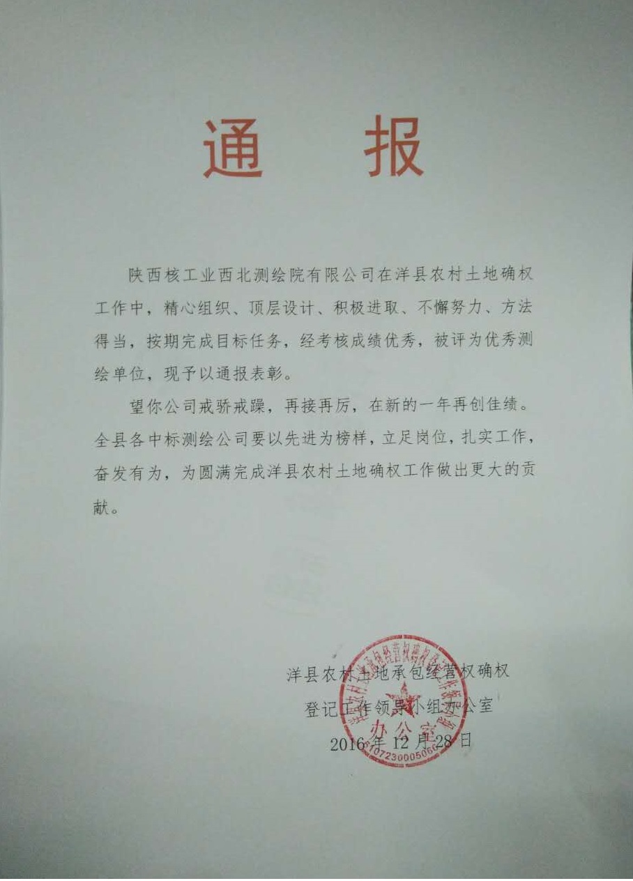 [2017-01-06]陕核西北测绘院土地确权项目再获业主表彰继武功农村土地承包经营权确权登记颁证项目获业主好评后,2016年12月28日,陕核西北测绘院承揽实施的洋县农村土地承包经营权确权登记颁证项目再获业主通报表彰。 洋县农村...