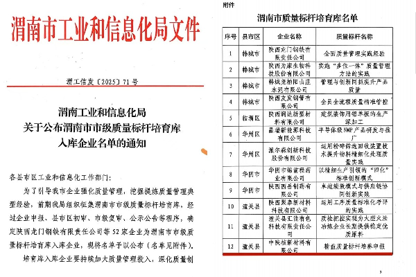[2025-08-05]中陕核新材料有限公司成功入选渭南市市级质量标杆培育库近日,渭南市工业和信息化局公布了2025年度市级质量标杆培育库入库企业名单,中陕核新材料有限公司凭借在质量管理领域的卓越实践与突出成果成功入选,成为市级质量标杆培育...