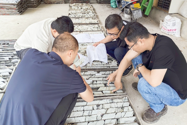 在评审会上,专家组一行听取了各项目负责人关于项目完成情况、工作质量及取得成果等的详细汇报。随后,专家组深入野外作业现场,对地质测量、槽探、钻探工程施工质量和绿色勘查等工作进行了实地抽查。最后,专家组查阅了各类原始地质资料,针对有关问题进行了质询,与项目人员开展技术研讨,并结合检查发现的问题,提出了具体的整改措施和建议。