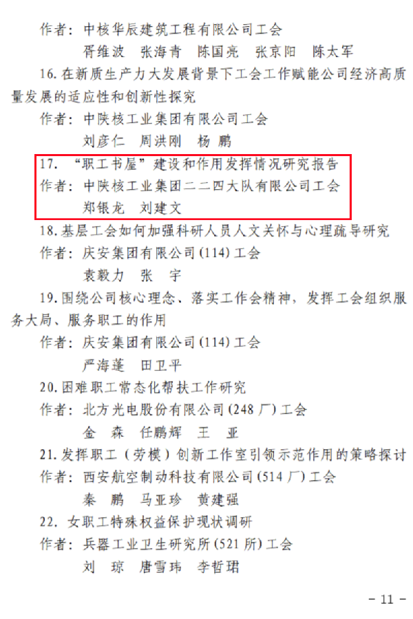 近日,在2024年度省国防工会系统优秀调研成果评选活动中,由王亚光、陈超撰写的《职工技能培训与职业发展路径实践研究报告》荣获一等奖,郑银龙、刘建文撰写的《“职工书屋”建设和作用发挥情况研究报告》荣获三等奖。