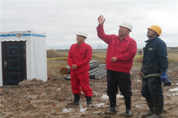 尽管季节刚刚走进10月,但高纬度的大庆却已是深秋。早晨,冒着淅沥的秋雨和瑟瑟的秋风,孔总经理带着新鲜的蔬菜和大肉,向正在五台钻机上施工的一线职工送去了节日问候。钻机之间相距甚远,加之前夜暴雨侵袭,井场土路低洼积水,泥泞不堪,车辆打滑,极易失陷,孔总下车步行前往钻机井场。每到一处井场,他都直奔现场,仔细查看井架结构、防喷装置和安全措施等至关重要环节,详细询问工作人员在作业、生活中存在的问题??鬃芏V龃蠹?,一定要克服严寒带来的工作困难,提前做好冬季保暖工作;一定要提高安全意识,及时整改安全隐患;一定互助互学,钻机之间取长补短,确保工作保质保量。