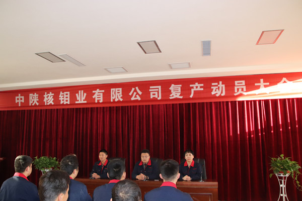 为落实好复产各项工作,9月30日下午,中陕核钼业有限公司召开了复产动员大会。何厚锦在动员讲话中强调:公司两级领导干部要积极发挥模范带头作用,带领全体职工加强学习,刻苦钻研,开拓创新,为圆满完成好二二四大队有限公司下达的年度任务贡献力量。王强详细地安排部署了复产各项工作,他要求:各部门、车间要细化复产各项准备工作,全面保障复产顺利进行。生产车间主任李升建、采购供应部部长刘振川做了表态发言。