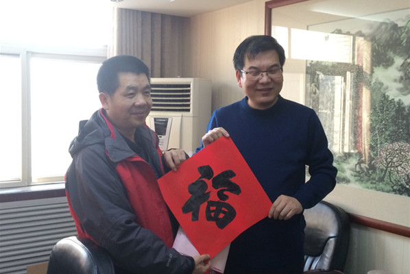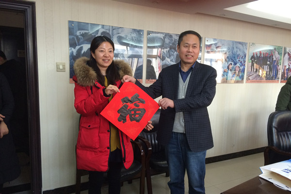 在活动现场,公司书法爱好者们即席挥毫,在喜庆的红纸上书写了一幅幅春联佳作。职工们闻着浓厚的墨香,纷纷前来目睹这一行行俊秀的书法和一句句美好的祝福,连连称赞。公司领导班子将一幅幅饱含寓意的“万事如意”“五福临门”等样式的春联与“?!弊智资炙偷街肮な种小?00多幅春联和“福”字被大家一扫而空。活动的举办,让广大职工充分感受到了浓浓的年味,真正把新春的祝福送进了千家万户。