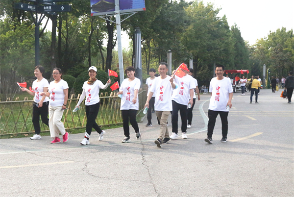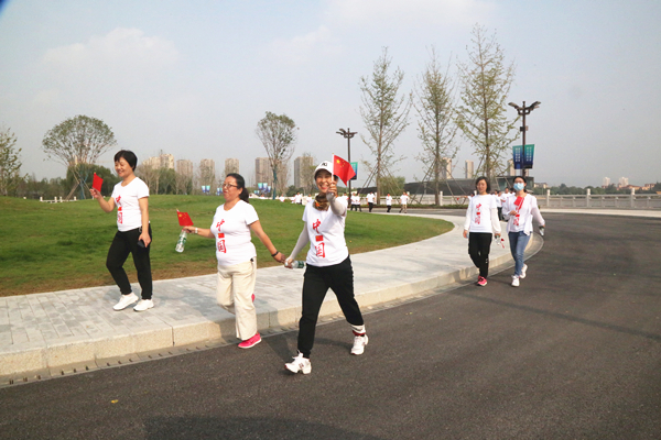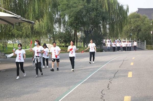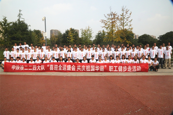在鲜红国旗的映衬下,公司100余名参赛职工组成“我?祖国”花式队形,脸上都洋溢着对五星红旗的无比自豪和对祖国母亲的深切祝福。大家以矫健的步伐,以昂扬的士气,走在西安世博园健步道上,一路向前,追赶超越,展现了二二四人的良好精神状态,彰显了二二四人的满腔爱国精神。
