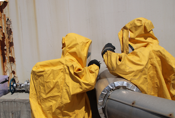 公司总经理助理、钼业公司总经理王强为本次演练总指挥。演练现场,王强总指挥接到硫酸车间硫酸罐底部阀门法兰处发生泄漏的报告后,立即下令启动公司硫酸罐泄露应急处置专项预案,应急救援队伍火速赶往事发地点。警戒疏散组迅速拉起警戒带对现场进行隔离,应急救护组对伤员进行紧急救护,现场处置组对泄露区进行喷水稀释,应急抢险组身着防护服、正压呼吸器对泄露部位更换损坏法兰,对泄露罐体进行密封。经过应急处置,泄漏得到有效控制,险情排除,演练圆满结束。