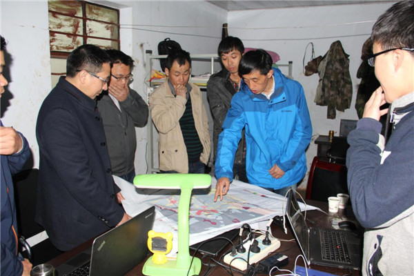 2月24日,地调院整装勘查分院院长程德进与东华理工大学邓居智教授一行三人来到工作区进行实地踏勘,在与项目部技术人员充分交流后,对该项目实施方案中电法测量设计的内容进行了全面的补充和细化。同时,程院长与项目负责张夏涛对勘查钻探施工场地及地质详情进行了全面实地踏勘,详细记录、分析有关实际情况,认真安排项目部的各项工作。