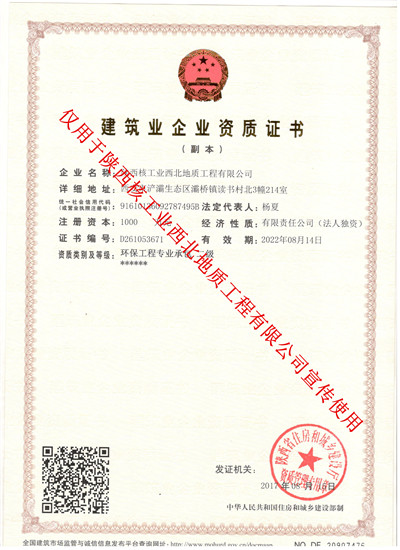 8月17日,经陕西省住房和城乡建设厅批准,陕核西北地质工程公司环保专业承包三级资质成功升为二级。