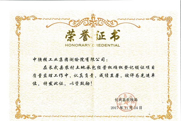 11月24日,中陕核测绘院长武县农村土地承包经营权确权登记颁证监理项目被长武县农牧局授予“先进单位”荣誉称号。荣誉既是对测绘院工作的肯定,又增强了全体项目人员打造优质项目、干事创业的信心和决心。