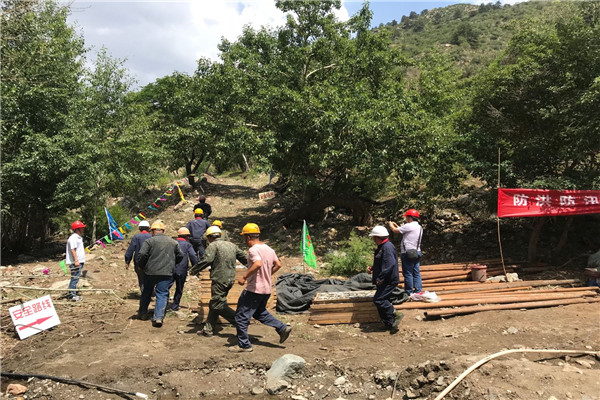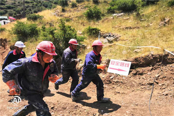 此次演练模拟钻探项目钻机现场突遇大雨,河水暴涨,危及人员生命安全和财产安全为背景。在钻机施工现场,成立了指挥部,指定了安全撤离路线和安全区域。上午9点55分,预警组发出河水暴涨警示,总指挥张少平发出“立即撤离”命令后,钻机班组立即?;?,全体人员严格按照预案指定安全路线迅速有序撤离,到达安全区域后,保卫组刘广建立即清点人数,全体人员顺利抵达安全区域。整个撤离过程仅用了1分15秒,达到了预期效果。