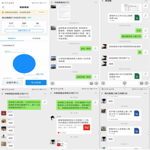 弹性复工,推进工作。公司全体职工在做好自身防护的同时,利用钉钉远程办公,及时开展网络审批各项工作;推出了全体职工每日钉钉健康打卡新措施,确保全体职工生命和健康安全;充分利用公司网站、微信公众号、职工微信群、部门(车间)管理群、疫情每日上报工作群、各级疫情防控文件领学等线上媒体及工作手段,积极宣贯疫情防控知识,及时上报防控情况,杜绝造谣、传谣,认真做好疫情防控每日上报及日常工作。